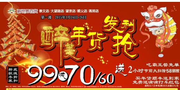 過年的腳步越來越近,京城各大百貨公司大都還未開始準(zhǔn)備年貨的時(shí)候,京城最強(qiáng)陣容新世界百貨五店率先啟動(dòng)“年貨發(fā)利”第一波?;顒?dòng)將再次出擊價(jià)格底線,新款冬裝極限...