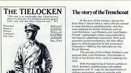 1912年,Burberry設(shè)計(jì)了一款名為“Tielocken”的防雨風(fēng)衣,它成為了Burberry標(biāo)志性Trench風(fēng)衣的前身。這種風(fēng)衣被廣泛應(yīng)用于第一次和第二次世界大戰(zhàn)的英國(guó)軍隊(duì)中。