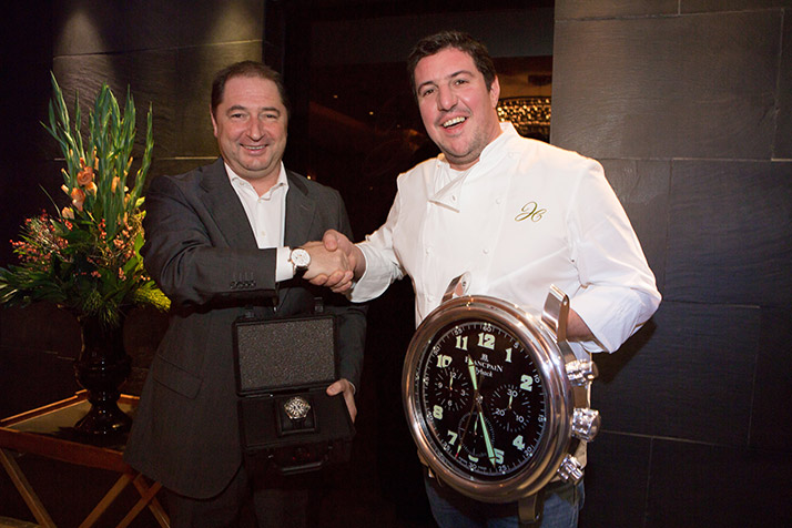 Blancpain寶珀全球副總裁兼市場總監(jiān)Alain Delamuraz先生為米其林二星主廚克勞德 博思頒發(fā)Blancpain寶珀500噚腕表