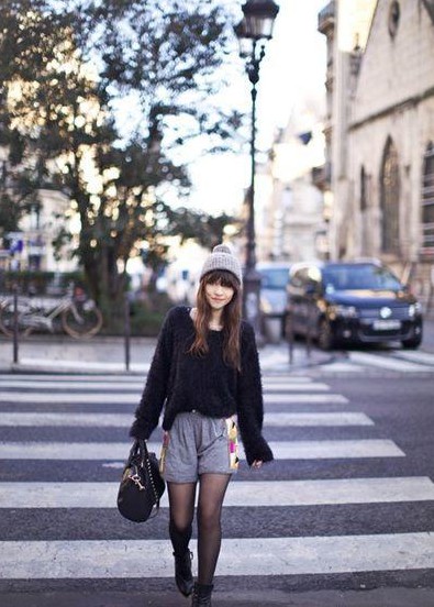 毛茸茸的羊絨衫寬寬大大,烘托出柔弱的股價(jià),搭配特別的短褲和絲襪,減齡賣萌又性感,針織帽的搭配也很亮眼哦。