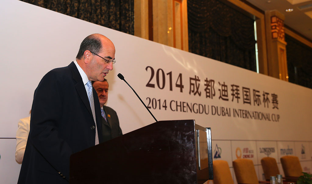 【風尚中國,涂新 成都攝影/報道】“本次2014成都迪拜國際杯賽獎金總額為375萬人民幣?!苯袢眨?月4日)上午,賽事執(zhí)行長官弗蘭克首次向外界公布,4月6日,成都?迪拜國際杯--溫江?邁丹賽馬經(jīng)典賽將在成都溫江金馬國際馬術(shù)體育公園正式舉行,5場比賽從50萬人民幣到150萬人民幣不等。