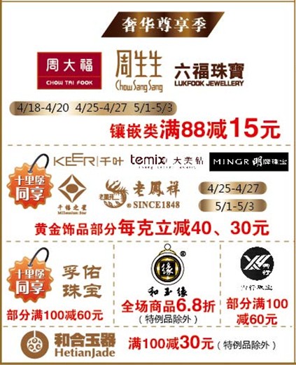 周大福、周生生、六福珠寶:鑲嵌類滿88減15元(4/18-4/20;4/25-4/27;5/1-5/3);