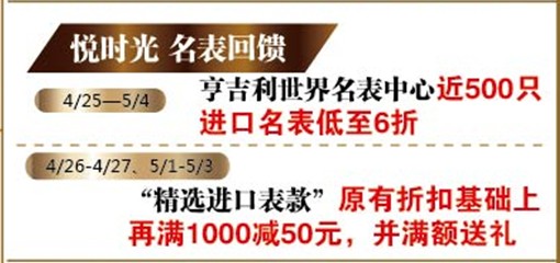 4月25日至5月4日,亨吉利世界名表中心近500只進口名表低至6折。4月26、27日,5月1日-3日,“精選進口表款”原有折扣基礎上再滿1000減50元,并滿額送禮。