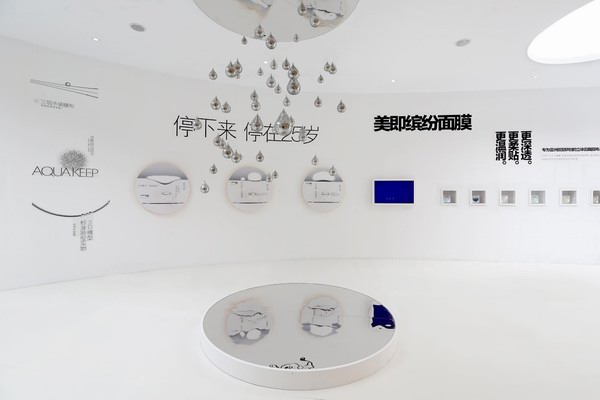 原生潤是美即品牌中絕對的明星,代表著面膜科技的世界最高水平,專為25-30歲輕熟肌定制,以三項深透傳導(dǎo)科技,提升肌膚的持水力。原生潤區(qū)也理所當(dāng)然成為了展館中最令人印象深刻的一站 —— 由原研哉先生操刀設(shè)計的產(chǎn)品外包裝,與純凈無暇的圓形墻飾融為一體,極具視覺張力;在純白空間及盈盈波動的水光之下,具象化的水滴裝飾為整個空間增加了更多靈性.