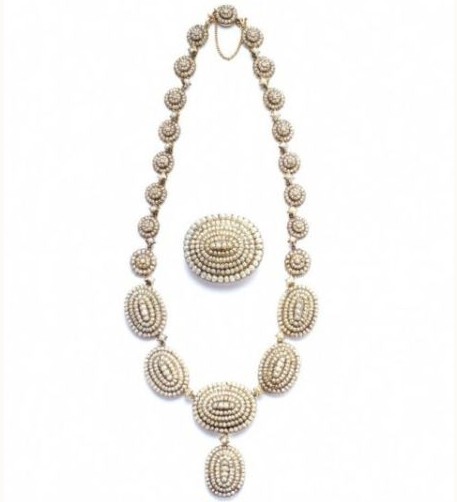 1861年,新當選的美國總統(tǒng)亞伯拉罕-林肯 (Abraham Lincoln) 為妻子瑪麗-托德-林肯 (Mary Todd Lincoln) 挑選了別致優(yōu)雅鑲嵌小顆珍珠的項鏈和胸針 (圖片為復刻品) 在出席他的就職典禮舞會上佩戴。每件珠寶都由橢圓形凸面黃金基座構成,其上鑲嵌呈同心圓狀排列的小顆珍珠。這套珠寶現(xiàn)收藏于美國國會圖書館中。在第一夫人的影響下,小顆珍珠珠寶開始流行于各種特殊場合,并成為風格時尚的新娘禮品。