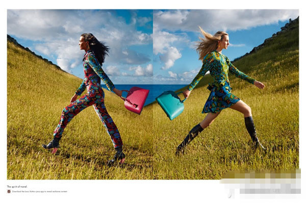 模特兒Liya Kebede、Maartje Verhoef、和Julia Nobis出鏡演繹,她們穿著充滿春夏風情的花卉圖紋,倚著紅色各種尺寸的箱包、手提著設計師Nicolas Ghesquière 嶄新設計的LV小包款,盡顯新的風情和潮流趨勢。
