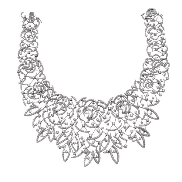 JEWELVARY La Vie en Rose玫瑰人生系列珠寶骨子里滲透了巴黎的優(yōu)雅與浪漫。它采用了立體鏤空這一具有創(chuàng)新精神的設計手法,由逾1300顆完美切合的鉆石,以密釘鑲嵌工藝鋪陳于白金菱形網(wǎng)格之上,而每個菱形網(wǎng)格的四個點,又以可獨立活動的鉆石連接,令其呈現(xiàn)蕾絲一般的輕盈、柔軟。每一朵玫瑰的花瓣、花蕊還有枝葉,層層分開,錯落交疊。那些火彩光芒像是被花香所陶醉,重又在那令人贊嘆的花瓣漩渦中深深落入,一個鉆進,另一個躍出,而一朵又一朵的玫瑰卻在無盡的璀璨中閃耀,仿佛接連盛放在無盡的春天。當項鏈繞于頸項間,并依曲線而起伏變化時,將女性的曼妙與婀娜展現(xiàn)到極致。這件重達28.52克拉的玫瑰人生鉆石項鏈,耗時6個月打造完成,全球限量一件,是每一個女人的夢想。