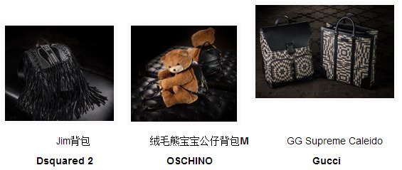 Dsquared 2的Jim背包采用牛皮、羊皮拼接,加上流蘇鉚釘元素,打造出時尚的朋克風(fēng)格。MOSCHINO于2015 秋冬秀后再次獻上Ready to Bear系列,絨毛熊寶寶公仔背包定能讓你的造型看起來更加與眾不同,充滿趣味。型格男士則可選擇Gucci的GG Supreme Caleido系列,獨特的幾何圖案搭配優(yōu)質(zhì)的皮料,輕松打造簡單時尚的風(fēng)格。
