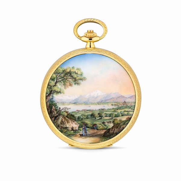 百達(dá)翡麗,獨(dú)特18K黃金及琺瑯獵殼懷表,配Suzanne Rohr 摹Jean-Baptise Arnout油畫作品的琺瑯彩繪,型號865/104,附證書,彩繪于1990年繪畫,懷表于2007售出