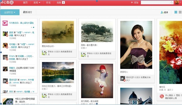 除了“美食派”與“旅行派”,在開心集品上,熱衷收集水墨山水畫、古詩詞、古色古香的國學(xué)作品圖片的“文化欣賞派”,專門收集最潮流、最時尚、最能體現(xiàn)品味的書籍和電影的“文藝青年派”, 以一網(wǎng)打盡歐美街拍、日韓潮流、型男靚女的穿衣搭配為宗旨的“服飾達(dá)人派”等眾多派別也大行其道。統(tǒng)計數(shù)據(jù)顯示,當(dāng)前各個“門派”中涌現(xiàn)出的“集品達(dá)人”已達(dá)近百位,比如用戶“emma”就以海量歐美街拍美圖成為“集品達(dá)人”。