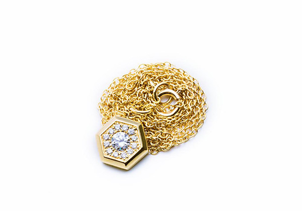 整個系列吊墜部分采用了雙面設(shè)計,吊墜的正面,設(shè)計師用鉆石代表星辰,12顆鉆石圈成環(huán)狀,將中間一顆大小約9分的鉆石圍繞,好比星空中的星群。