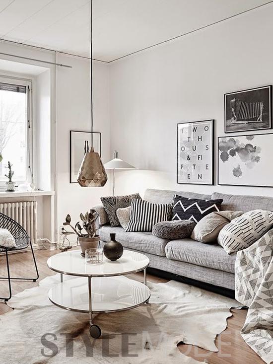 2-3個(gè)茶幾組合,在組合、款式、尺寸上稍微變化,就能打破大茶幾在空間中的沉悶感。除了放在正中間的茶幾外,在沙發(fā)扶手旁擺放一個(gè)裝飾性小茶幾,放一盆綠植、幾本書(shū),增加空間的趣味性。